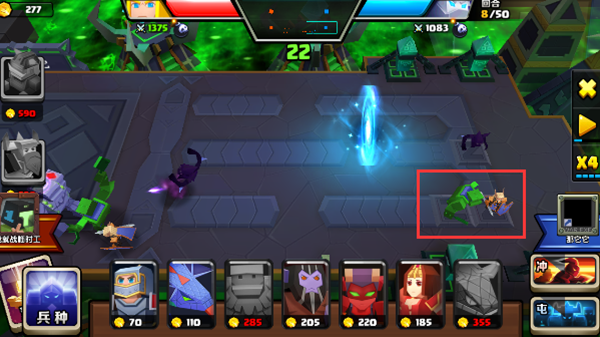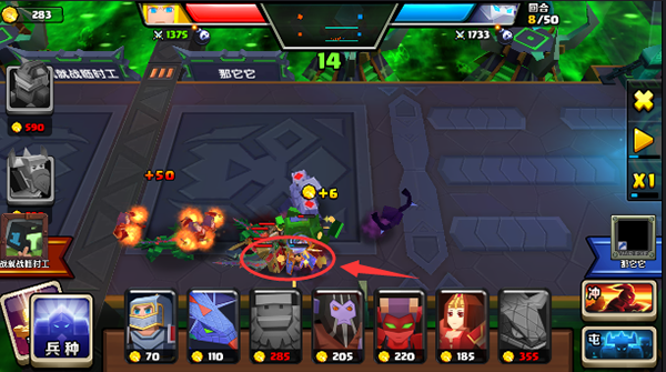 2、前排区:前期放置单兵作战能力强的兵种,随后补充 防御型的兵种,用于吸引敌人攻击火力。