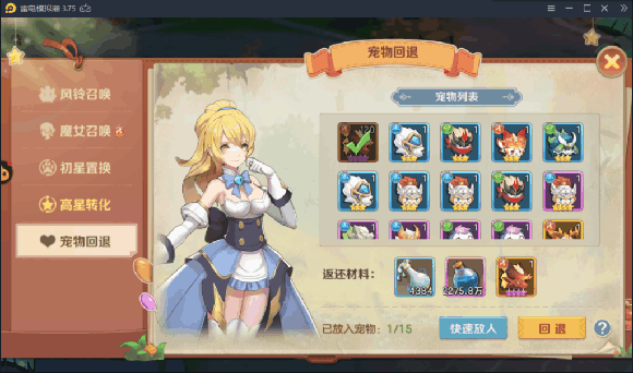 首先我们来讲一下宠物,前期提升战力最有效方法之一。首先抽宝宝可能没抽到你想要的5星宠物,没有关系,经验和洗灵露都先喂一个宝宝提升战力,后面抽到自己想要的5星宠,用唤灵里的宠物退回功能把培养的资源回档,这里退回的5星宠还是保留的只不过等级变成一级。