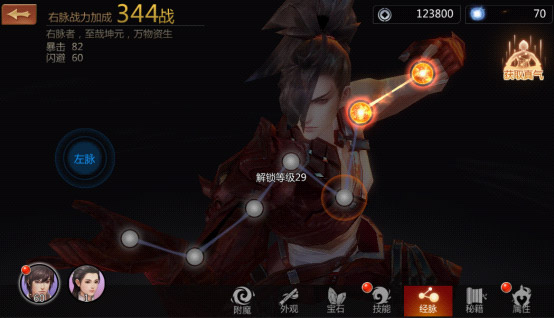 点击【角色】→【经脉】→选择【左脉】或者【右脉】→选择需要打通的穴位→在穴位内打通气门会获得战力和属性的加成!