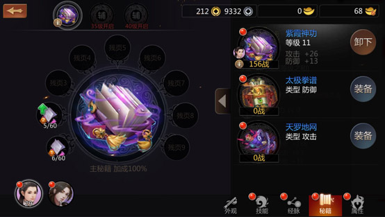 每个角色可以装备3本秘籍,主秘籍属性加成100%,辅秘籍1属性加成30%,辅秘籍2属性加成20%。