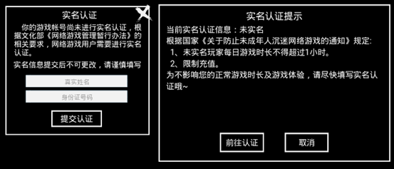 进入游戏,第一步需要进行实名认证,未实名认证或实名认证不通过的玩家,将受到一定限制,即每天仅可登录1小时,且凌晨不可登录游戏,限制充值。