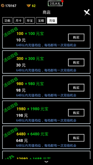从商店直接购买元宝,648以内充值档位,每档都有一次双倍机会。【每个账号永久仅有一次,不排除后期活动更新双倍的可能性。】