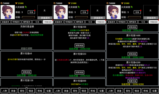 人物、装备、背包、锻造、商城、设置:(详细介绍请见第三章 技巧篇)