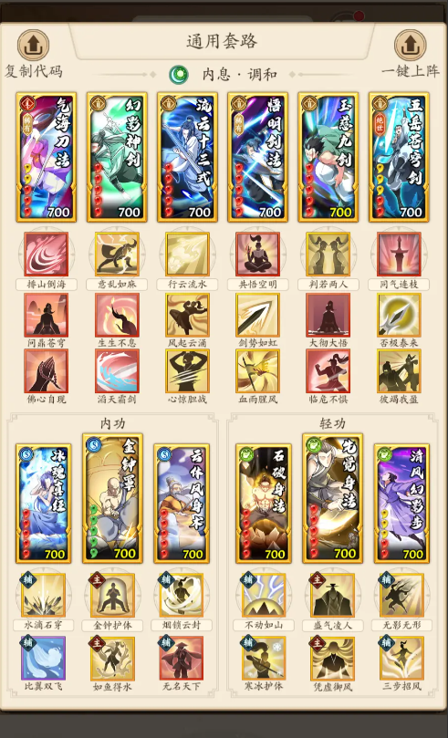 此阵容阴内息以及调和内息都比较适用,控制较多,招式丰富,搭配七步分身术可以增加减伤以及连击率。玩家可围绕阴奇门的核心武学,搭配能造成混伤和控制效果的招式来组建阵容。
