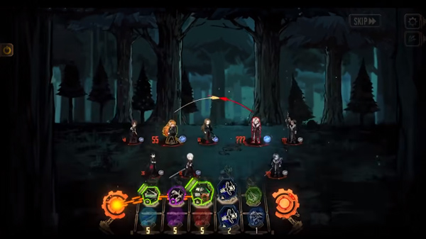 先介绍一下界面,为了方便你们理解,我会将边狱巴士公司的系统带入图书馆进行讲解。下面的这个界面,你们可以理解为所有角色的行动槽和卡池,开场的时候只有5条技能栏,每条技能栏下方都有一个角色的头像,随着战斗程度的变化,目前每个人最多拥有3条技能栏,这个竖条技能栏其实就是角色的速度。