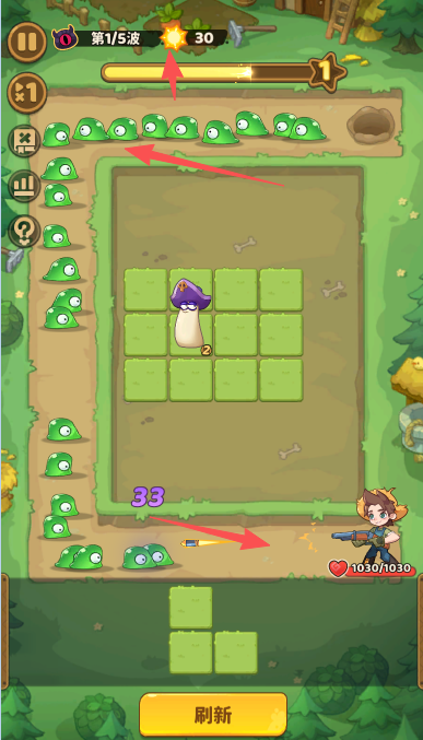 3、努力在5个波次中,不断的建筑更多植物,帮助你击败这些正在入侵庄园的怪物。
