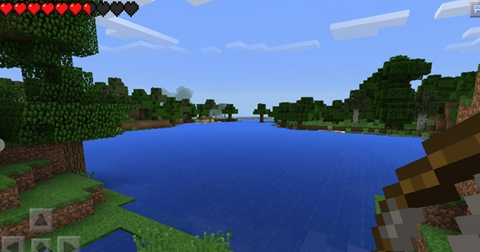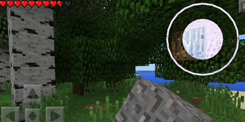 第二天天亮后,该从临时落脚处出来去采集资源了。在Minecraft里你可以用多种方法收集某个物品,但在游戏初期,你只能用赤手空拳去打落你需要的东西了。比如木头,你要先靠近一棵树,手指长按中间的树干,直到白色区域填满手指位置的圆圈、树干的一节粉碎掉落在地上并且捡起后,才算得到了一块木头。相同的方法还可以用来采沙子、泥巴和黏土等。