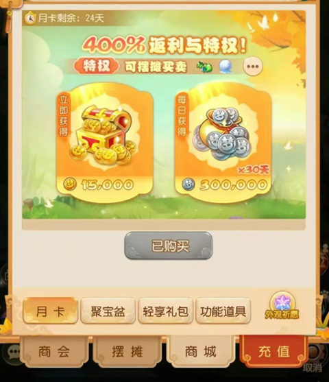 月卡(30),充就送15000金币加每日50w银币以及金柳露可交易,个人感觉开不开都行。