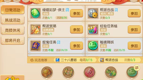 师门30、点赞5、押镖9、三界10、抓鬼20、秘境25、挖宝10、科举10。