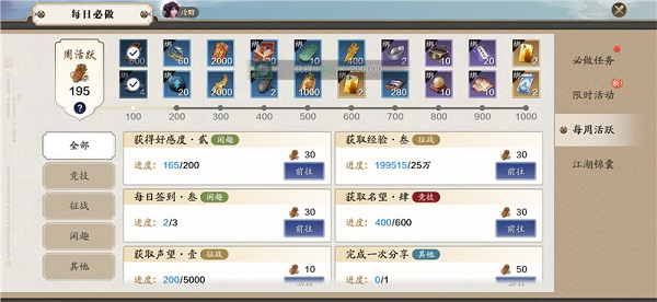 通过完成每日任务来提升周活跃值,活跃值每提升100可以领取一些奖励,这些奖励中就含有提升装备等级的材料,完成天涯战令的任务要求也可以领取材料。