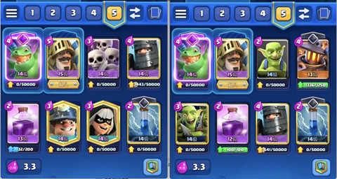 第一种最为经典,虽然耗费较高,但是恐怖的推进力是毋庸置疑的,而且圣水收集器还有骗对面解牌的作用,大闪还可以一举清扫防御单位,作为进攻方面无可挑剔,但是大家可能会觉得这套卡组的防守能力可能有些不足,这个问题可以有两种解决方法第一种就是可以用卖几方防御塔血量的方法来换取优势,第二种则是大家在玩的时候看卡组的方向不要太死,这套卡组里的每一个组件都是可攻可守的,比如圣水收集器就可以完全当一个牵引建筑来使用。在取得费用优势的时候再一举反推对面。