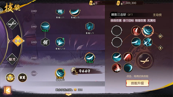 3、技能界面玩家可以自行选择对技能的搭配,居合狂刀,多种技能任意搭配,玩家还可拖拽技能切换位置;