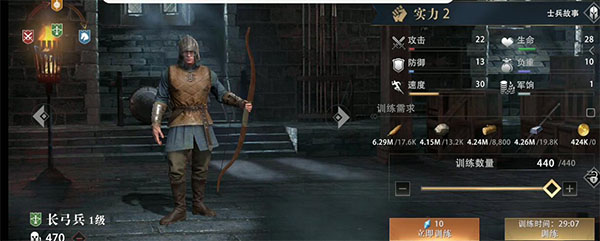 当然,在兵营中还有非常多兵种供小伙伴们选择,以等级3类型的士兵为例,可以训练重装步兵,重装骑兵,重装枪兵,重装弓兵这几类。相较于等级1的兵种来说,等级3的兵种在各方面战斗属性都有非常明显的提升,如果敌人用等级3的兵种和我们等级1的兵种战斗的话,我们无疑是以卵击石。因此若想扩充自己的战力,要做的事情就是尽快解锁这些高阶兵种了。
