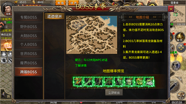 打遗迹绿洲BOSS爆青龙装备,每个BOSS需要消耗凭10点体力值。