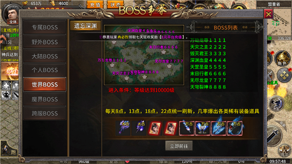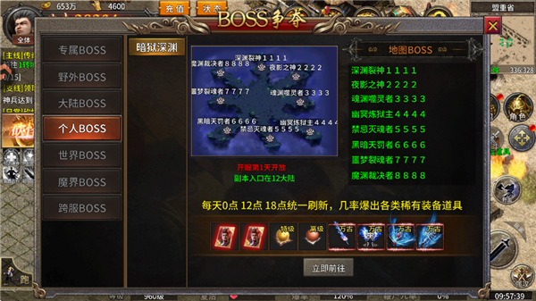 每天固定刷新4次,装备爆率是野外BOSS的50-150倍。
