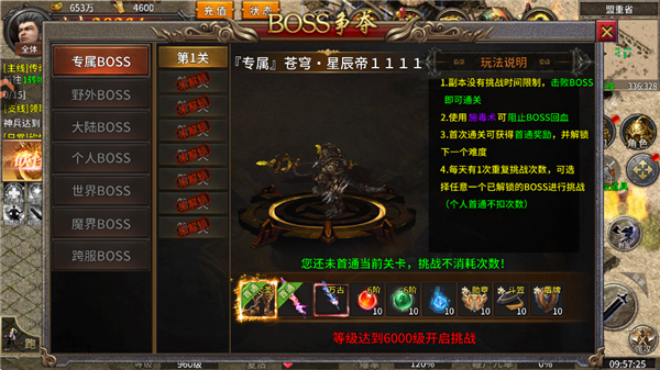 每天固定刷新3次,装备爆率是野外BOSS的25-150倍。