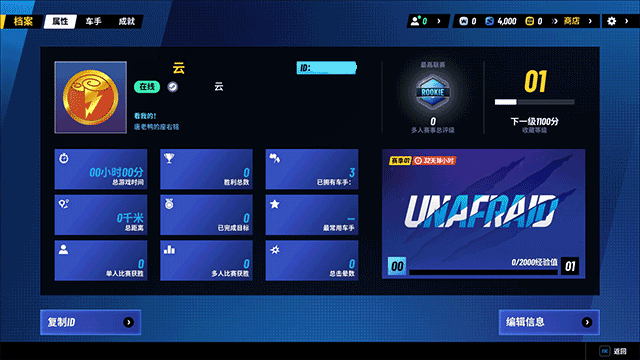 2、在玩家档案库中,玩家可以了解到来自于赛车手自己的各种基本情况,比如游玩时间、已完成目标、胜利总数、多人比赛情况等,玩家也可以在这里通过复制ID的方式邀请好友一起参加比赛。玩家还可以通过在自己档案里选择并点击“编辑信息”的选项对赛车手进行自定义;
