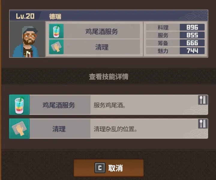 自带的鸡尾酒和清理服务技能在前中期没有解锁分店的时候,当做主店主力服务员使用,过渡很丝滑。