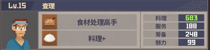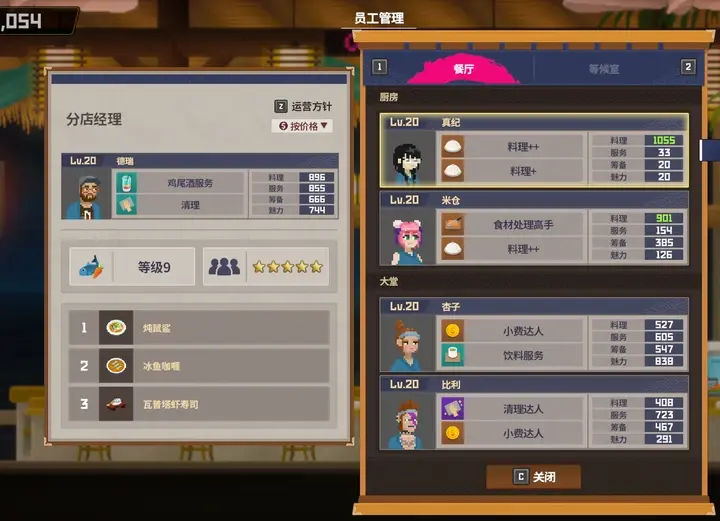 除去主副店的九名员工按理说剩下的12人都是派遣人员之一,其他属性比较差的我只给了15级解锁全技能和菜谱,像是查理这种筹备和魅力双低的拉20的必要性也不大。