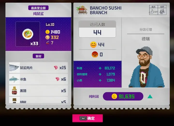 分店需要再额外安排一个分店经理,分店经理的的料理评分会影响处理料理的等级,大堂经理是什么都干的四项属性都很重要,而德瑞各项属性都很高,而且10级就能解锁5星,做所有的菜,升到15级也能获得冰鱼咖喱,这道菜也是咖喱派对毕业菜的首选。