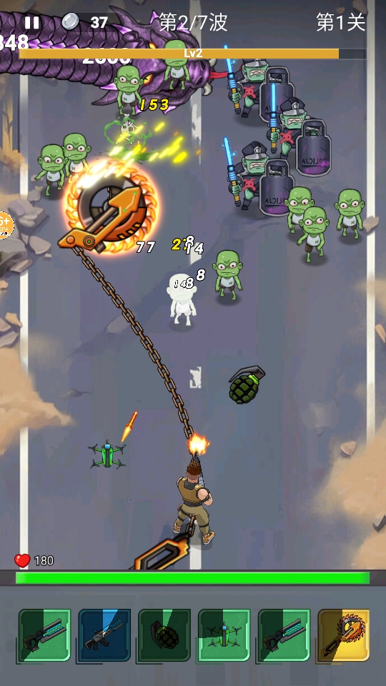 3、越到后面出现的僵尸数量就会越多,玩家可以利用场上的道具来帮忙击杀僵尸,只需要移动角色到最左边或是右边即可