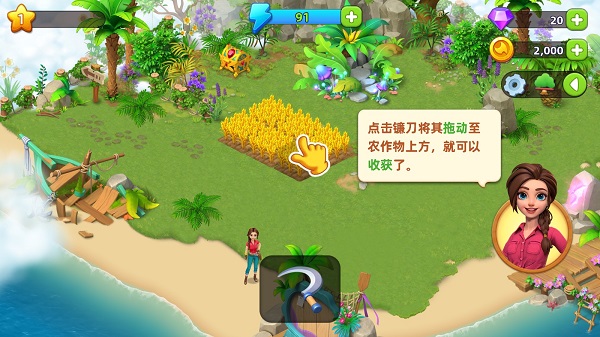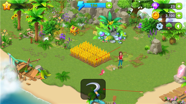 1、点击镰刀将其拖动至农作物上方,就可以收获啦!