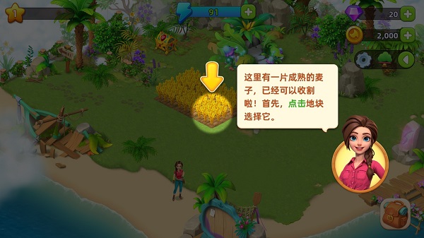 这里是农场,上面已经有一片成熟的麦子,你可以点击地块完成收割。