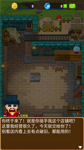 1、下载进入锻冶屋英雄谭游戏,通过和上任老板对话,了解这个店铺;