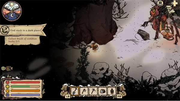 从头骨出发,穿过草丛向北,进入头骨所在位置上方的黑暗区域。装备Gnawtusk的灯笼,这样这里能更好地在黑暗中看东西。现在,在骷髅上方后,向北右走,直到找到另一个废弃背包。这里有两个常见的草药储藏点可以带走——这样总数就有三个。