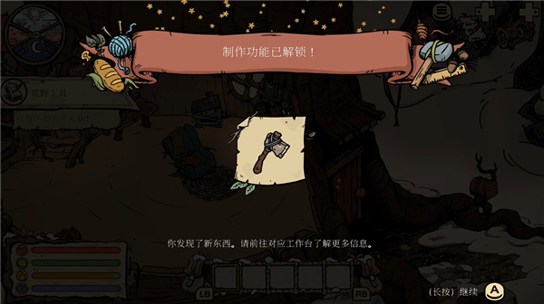 7、将工具装备起来,继续前往野外探索收集,当屏幕出现寒冰时,需要回洞穴取暖,等待数值没有会死亡!