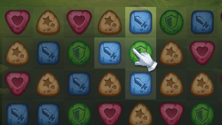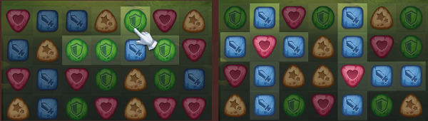 将4个符文连成一条直线,或5个符文组合成L/T型消除,会发动1次技能1,同时也会生成1个技能符文。消除技能符文后,对应的英雄则会触发技能2。