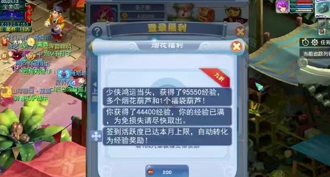 开完葫芦之后,我们把这个活跃度的宝箱领一下。这个时候我们已经是7100万经验了,加上刚刚那200个帮派活动和中午的帮派强盗,我们今天就可以到达8000万。还有本事和尚,还有国子监答题,这些我们可以达到8000万。
