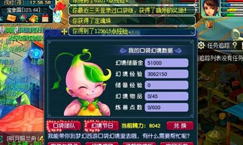 梦幻西游在每个月的9号的时候是口袋幻境节。各位玩家可以去宝象国找葫芦精灵去答题,总共就10道题目,答对以后可以获得经验奖励,而且大家如果在最近的三天内登录过口袋版,获得的奖励还是翻倍的,除此之外,大家在答题的时候也有一定的几率会获得额外的道具奖励,上面的这位玩家现在就答题获得了一个定魂珠的道具奖励。点点鼠标就能拿到的奖励,谁不做就有点傻了。