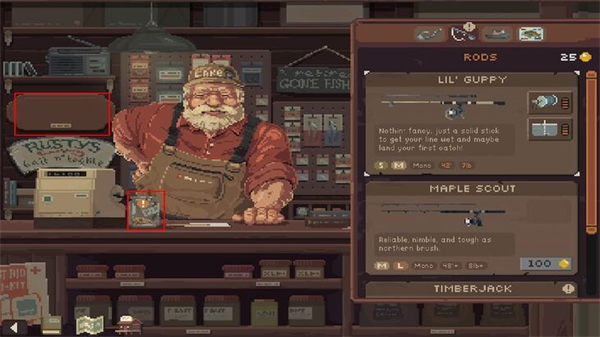 3、然后,往老板Husty的储钱罐里投一枚金币,会触发一小段对话,对话结束以后获得购买“灰熊柱杆”也就是可以钓XXL品质鱼的钓竿的资格。