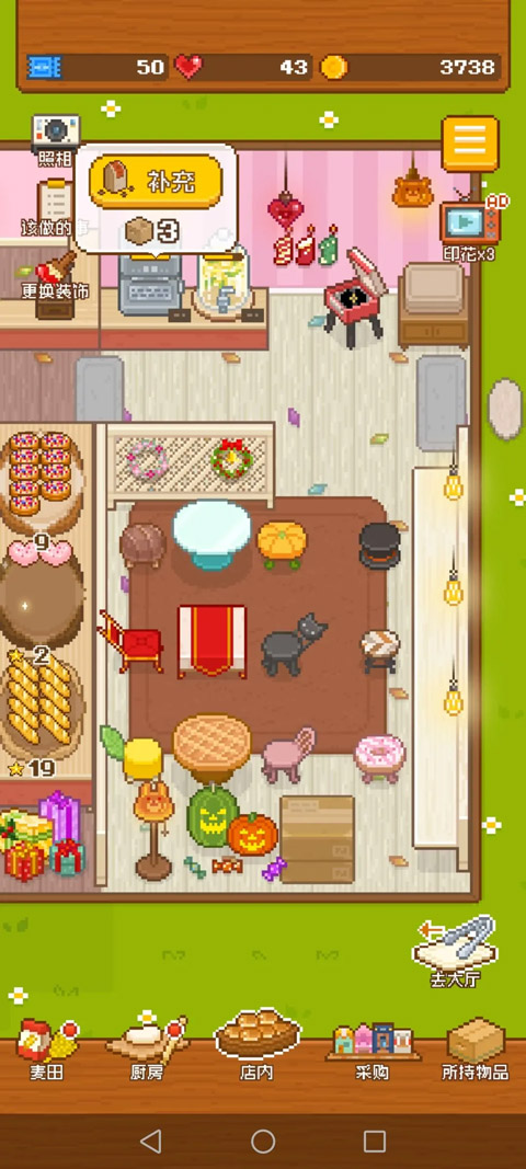 店内也可随意装饰,看自己喜好,可以改变面包台,加椅子,安置花盆,安装提灯等。总之让自己的店看起来更漂亮,还能增加顾客的购买率。家具可以在家居商城购买,也可以在卡池抽奖获得。如果有外卖电话记得随时接听,接单可以有效提升店铺名声。