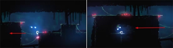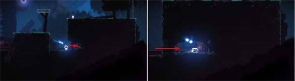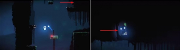 有些表面和平台有“边缘”,如果你没能到达另一边或悬挂不住,可以抓住它们。这个房间的洞有这样的台阶。Sheepy如果从岩台掉落,会立刻抓住它,前提是离岩台足够近。