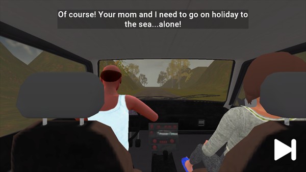 3、成功进入到游戏中去,我们会出现在一辆车上,在这里的对话中,我们可以知晓父母为了享受双人假期时光,把我们丢给了乡下的祖父母。