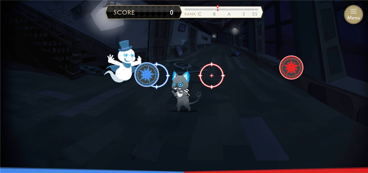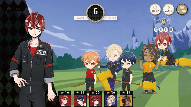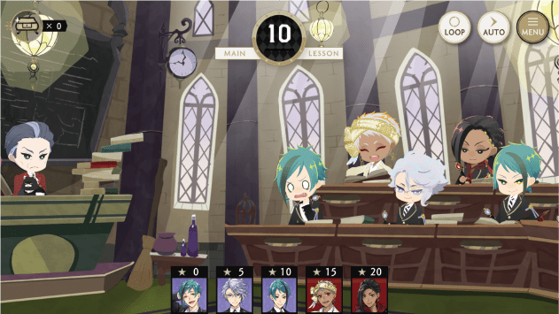 节奏玩法里,你需要跟着音乐点击跳动的音符来得分,同时还能看到Q版角色的动作和角色之间的有趣对话。