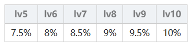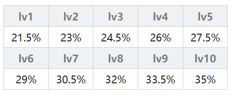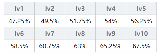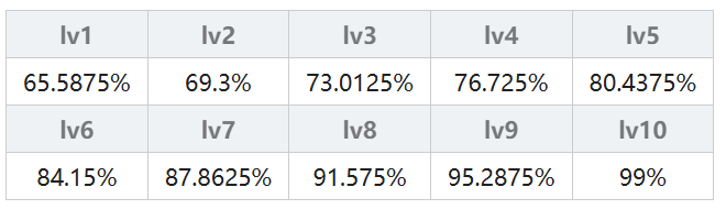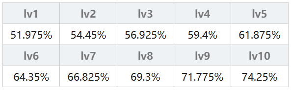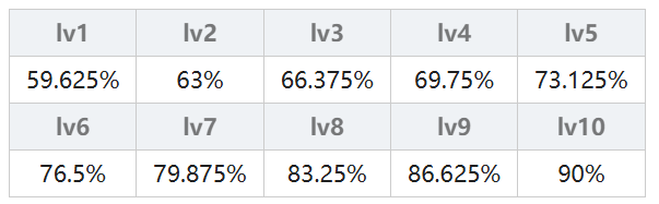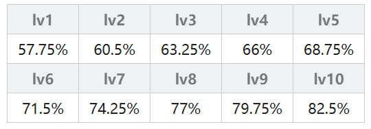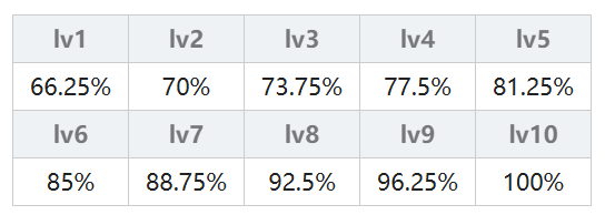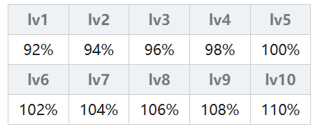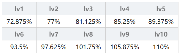 由连击次数决定,一连击(弱)的连击倍率为 50% + 2.5% × (魔法等级),一连击(强)的连击倍率为 62.5% + 3.75% × (魔法等级);二连击(弱)的连击倍率为 47.25% + 2.25% × (魔法等级),二连击(强)的连击倍率为 59.625% + 3.375% × (魔法等级);三连击从lv5开始计算,三连击(弱)的连击倍率为 50% + 2% × (魔法等级),三连击(强)的连击倍率为80%;无属性另做计算其实就是火、木、水属性×1.1。具体结果在下表中,不想计算的可以直接查表。