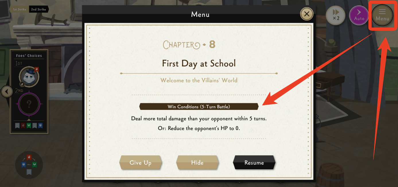 一共有三种类型的战斗。玩家可以通过在战斗中点击Menu(菜单)按钮获取战斗胜利条件。
