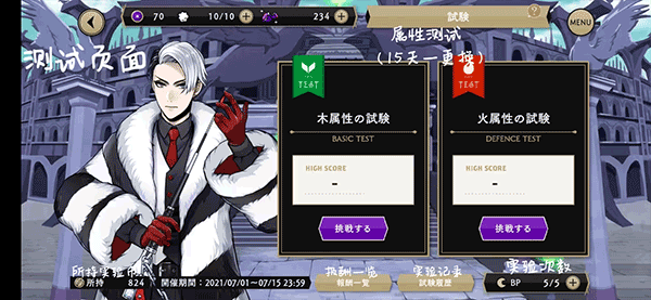 试炼页面,共5种属性,分别为木、水、火、无属性和全属性,15天一更换卡片共两种属性魔法,可升级增加攻击力