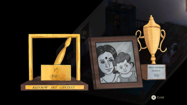 2、进入游戏剧情,在房间里进行探索,床头放着小时候和妈妈的合照