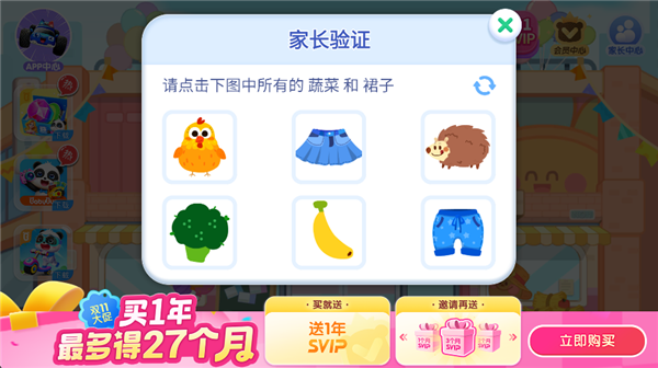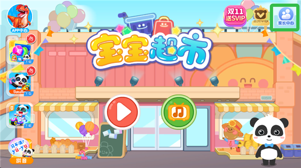 1、打开宝宝超市宝宝巴士启蒙游戏,点击右上角【家长中心】。