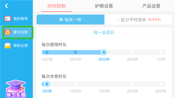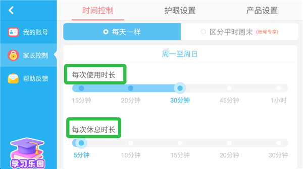 4、家长可以设置孩子每次的使用时长以及休息时长。