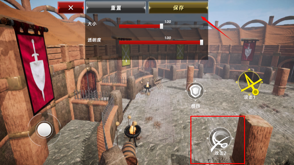 5、向"下"滑动"攻击1”按钮并按住,可以攻击敌人"下方”