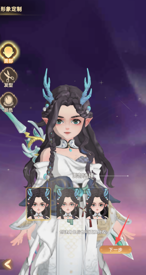 2、随后玩家可以更改角色的外观,完成后,点击屏幕右下角的“下一步”。