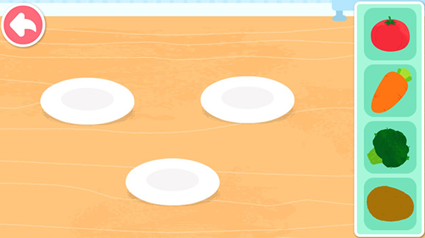 3、之后就可以让宝宝选择右边自己喜欢的蔬菜装盘啦!让宝宝点击右边内的蔬菜拖入盘中即可。