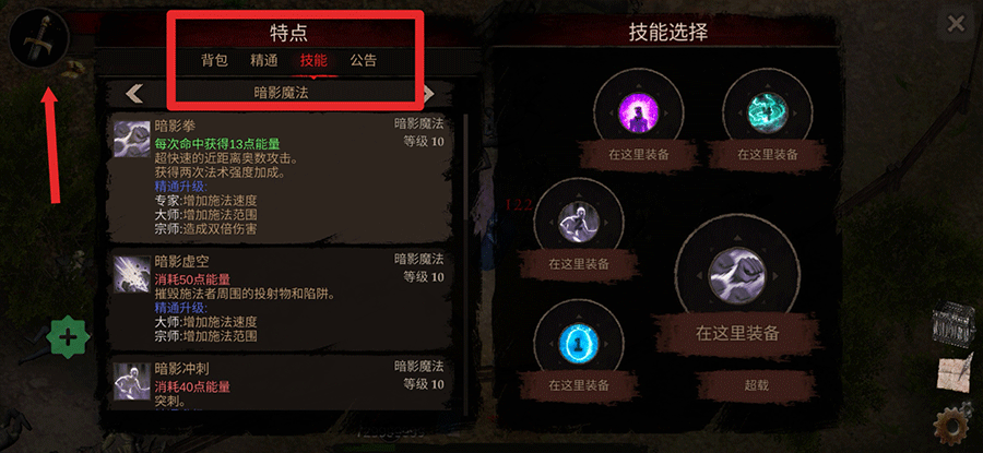 5、点击左上角的宝剑图标即可打开功能菜单,在这里可以调整技能配置、升级能力或查看装备详情。