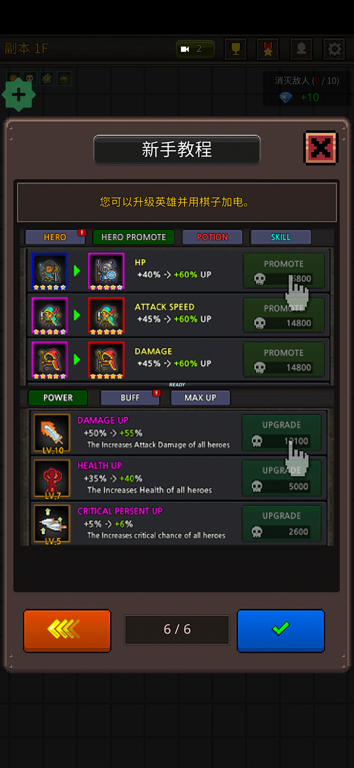 6、此外,你还可以通过升级英雄或利用棋子为角色进行强化,让队伍实力进一步提升。