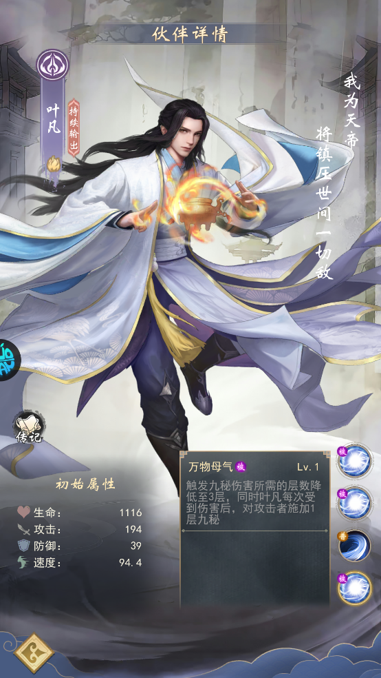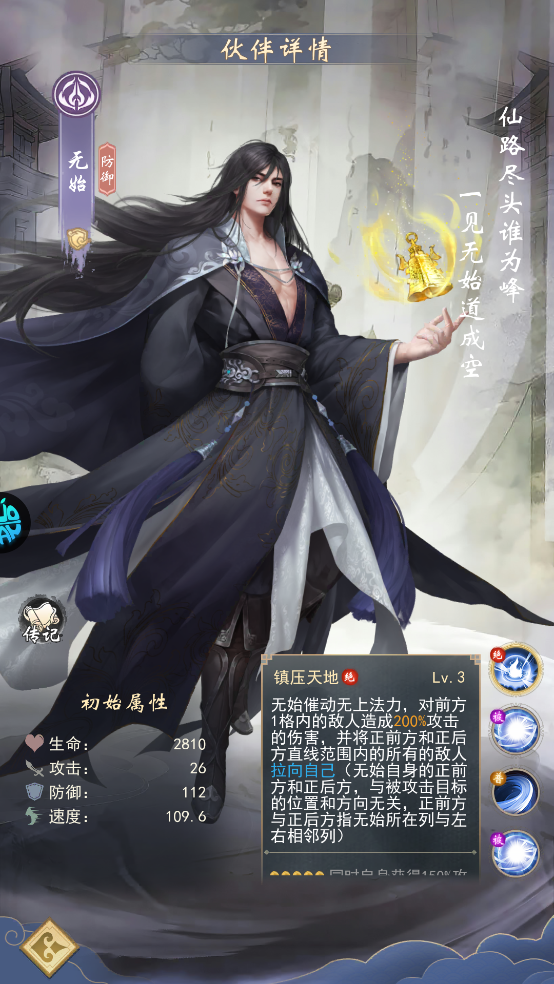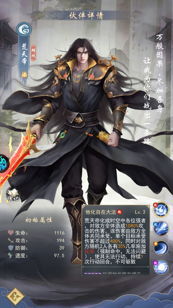 荒天帝:帝星品质,攻击成长最高,大招「他化自在大法」可造成敌方群体900%攻击力的伤害,人数越少伤害越集中,配合「一剑断万古」单体爆发,兼具AOE与单体斩杀能力。